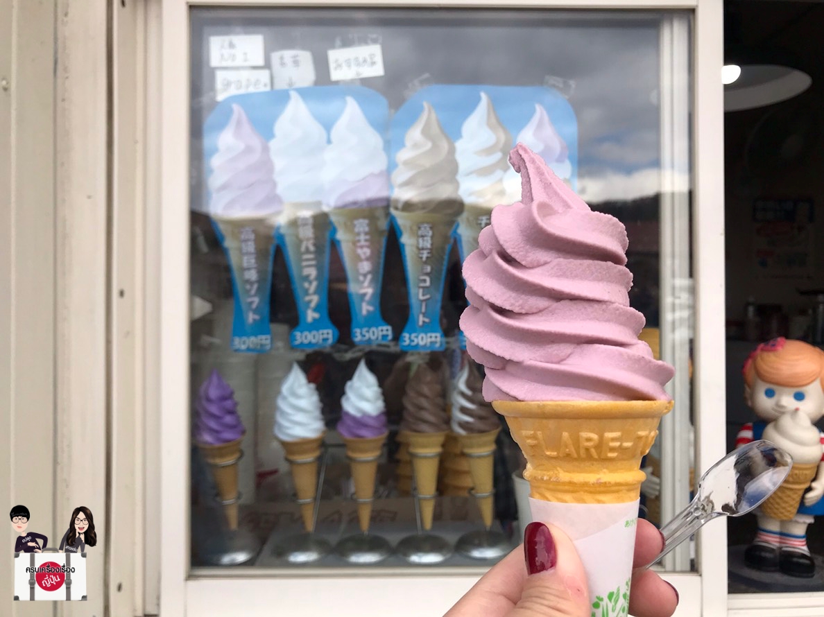 มาถึงแหล่งของนางแล้วต้องลองจ้า เพราะองุ่นเป็นสินค้าเกษตร OTOP ชื่อดังของจังหวัดยามานาชินั่นเอง ดังนั้นไอศกรีมรสชาติองุ่นซึ่งใช้องุ่นสายพันธุ์ Kyoho (巨峰ぶどう) สีม่วงดำมาทำเป็นซอฟต์ครีมนี้ค่ะ บอกเลยว่าต้องลองค่ะ รสชาติเหมือนกินน้ำองุ่นเลย ไร้ซึ่งความเป็นนม หวานอมเปรี้ยว ใครที่ชอบรสชาติแบบนี้คือ ฟินมากจริง ๆ ค่ะ